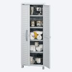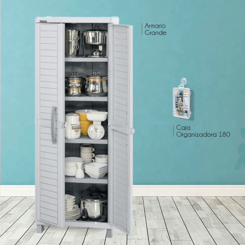 Armario Grande con 4 entrepaños ajustables que resisten hasta 25 Kg cada uno. Fácil de armar, mover y limpiar. Con la resistencia y beneficios del plástico. Excelente capacidad interior, con orificio para uso del candado para mayor seguridad. De apariencia moderna y elegante. Ideal para interiores y exteriores.