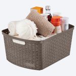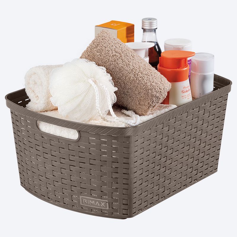 Canasta tejida con apariencia Rattán. Ideal para organizar y decorar. Tiene manijas en sus dos extremos y capacidad de 12 Litros. Ideal para organizar en closets, baños, cocina, cuartos, entre otros. Colores de tendencia para el hogar.