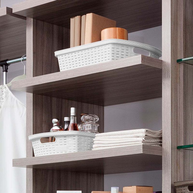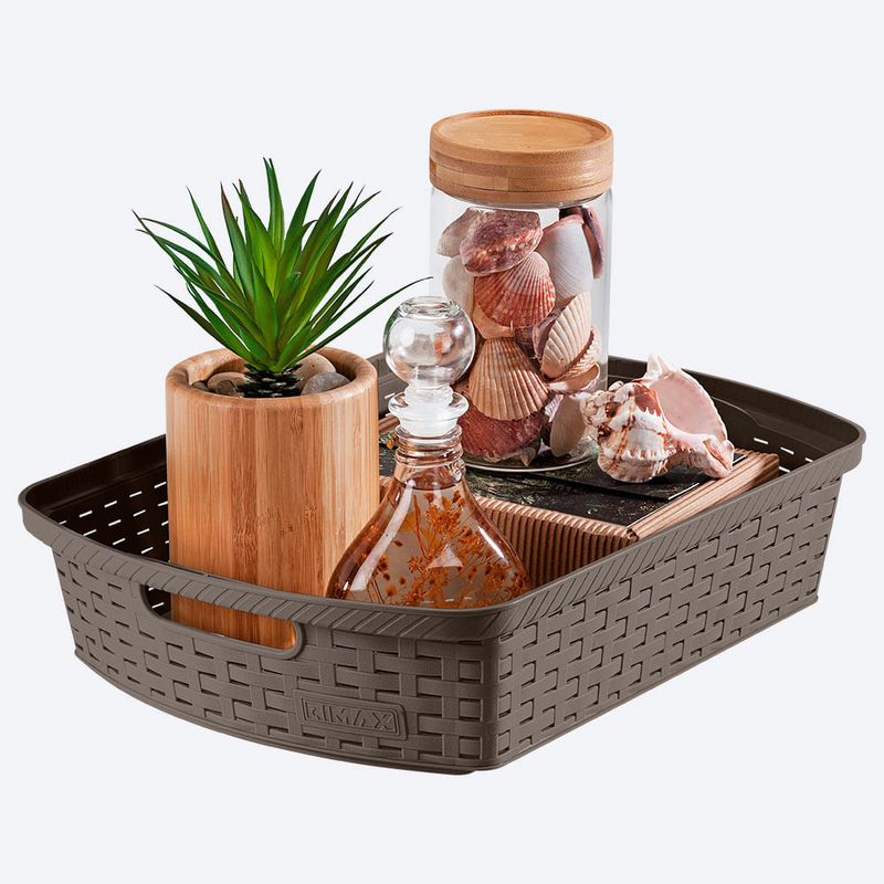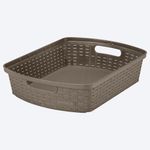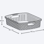 Canasta tejida con apariencia Rattán. Ideal para organizar y decorar. Tiene manijas en sus dos extremos y capacidad de 6 Litros. Ideal para organizar en closets, baños, cocina, cuartos, entre otros. Colores de tendencia para el hogar.