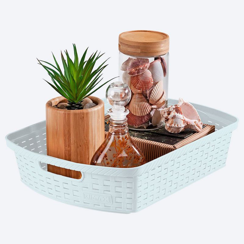 Canasta tejida con apariencia Rattán. Ideal para organizar y decorar. Tiene manijas en sus dos extremos y capacidad de 6 Litros. Ideal para organizar en closets, baños, cocina, cuartos, entre otros. Colores de tendencia para el hogar.