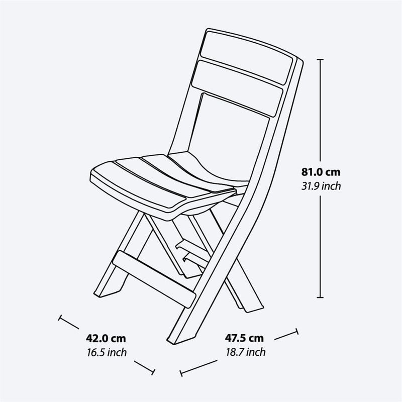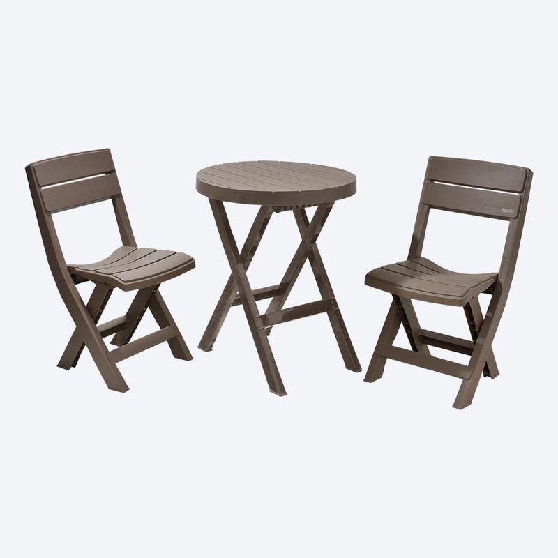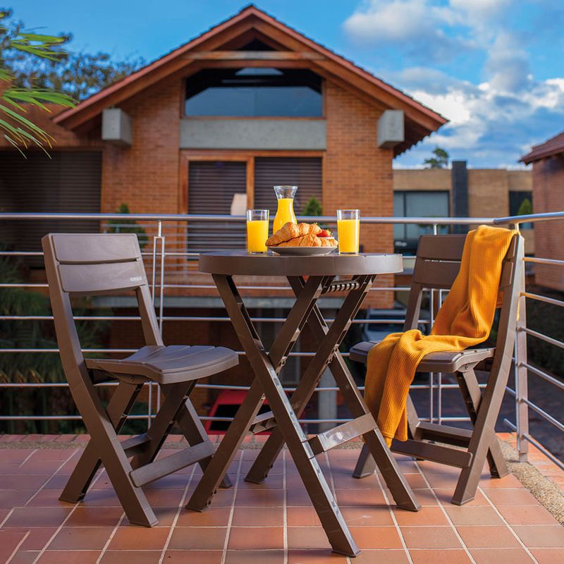 Mesa y sillas plegables que facilitan el almacenamiento y la movilidad.