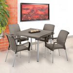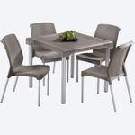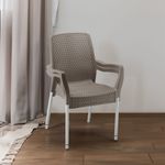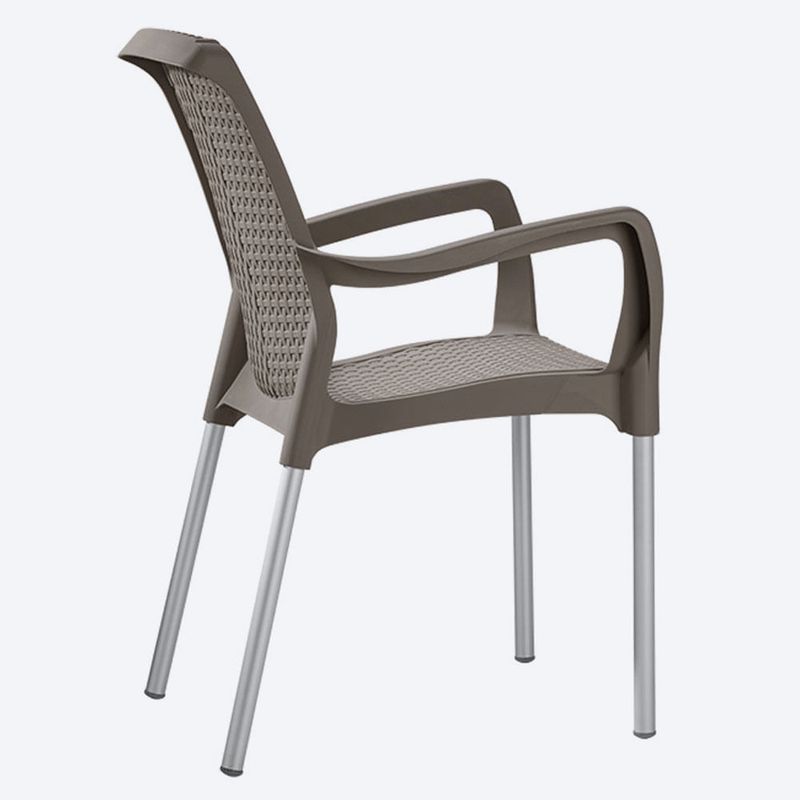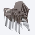 Silla SHIA apariencia Rattan, con tejido perforado que imita el tejido artesanal. Exclusiva mezcla de materiales y patas en aluminio que no se oxidan. Con tacón antideslizante. Cómoda y ergonómica.